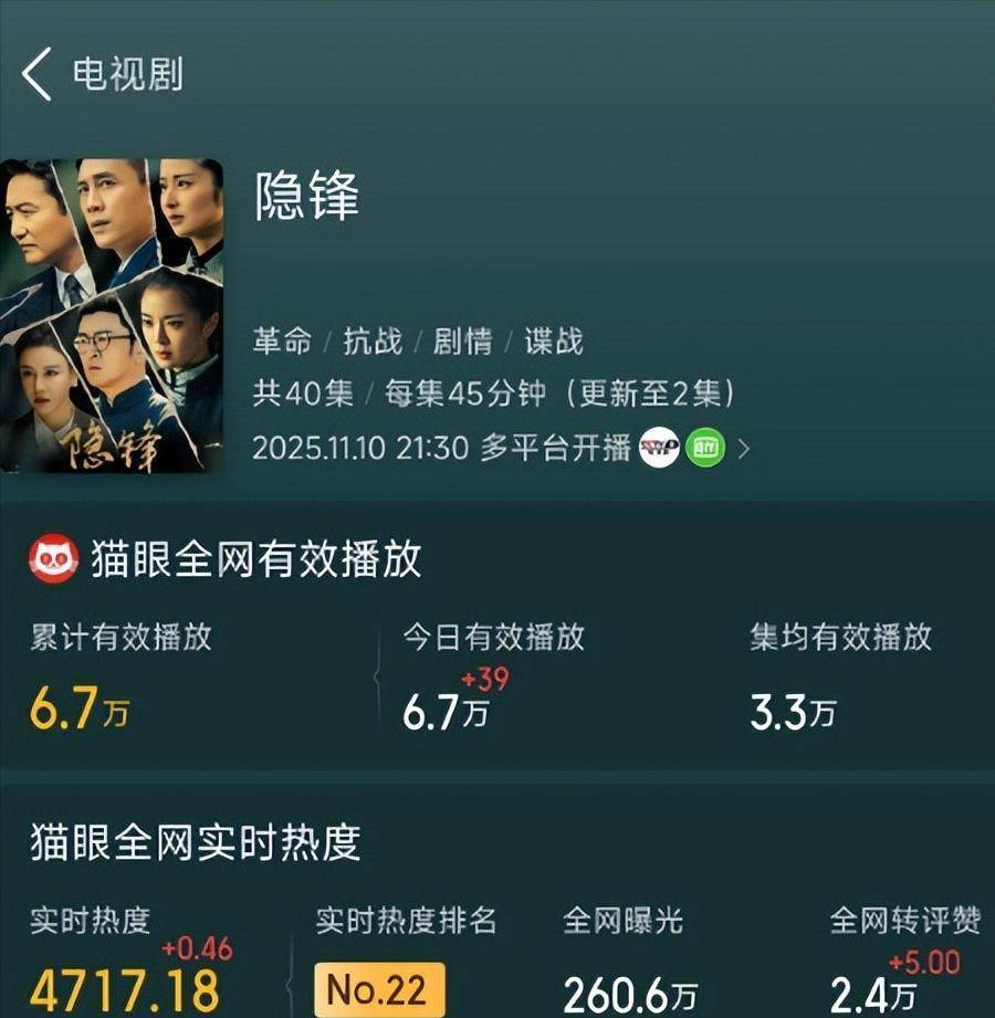 虽然央视收视率轻松破1,但网播平台上,《隐峰》连热播榜前十都没挤进去,直接被甩到20名开外。两天播放量才6.7万,这数据看着都让人心疼。